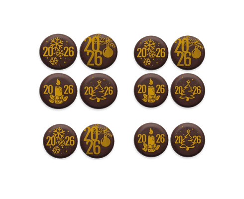 Ассорти медальонов "2026"с четырьмя различными принтами. Идеально круглые, тонкие, с шоколадным вкусом. Украшение впишется в любую выпечку, кондитерские изделия и десерты новогодней тематики.