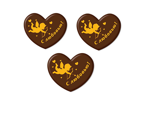 Шоколадные сердечки с надписью “С любовью!” и рисунком в виде ангелочка, стреляющего из лука, для самых искренних и волшебных моментов Дня Влюбленных и подобных мероприятий..