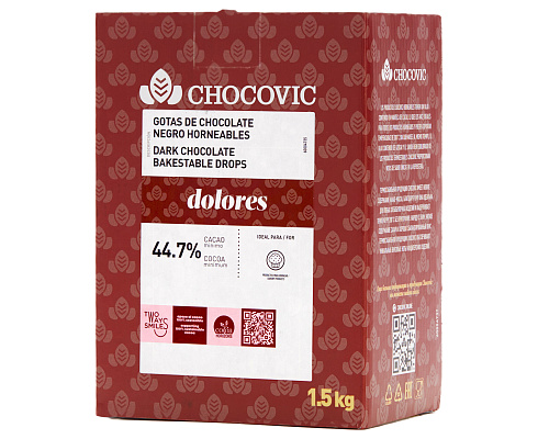 Термостойкие капли из темного шоколада 44,7%. Прекрасно подходят для декора различных десертов, тортов и мороженого, а также для использования в хлебе и булочках, круассанах, пирожных или печеньях.