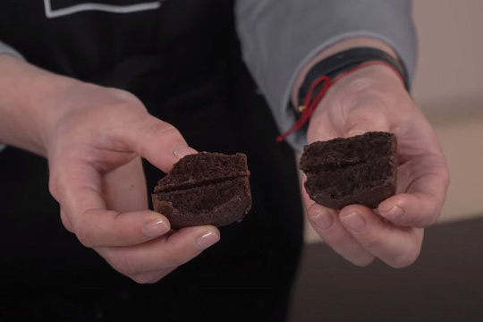 Главное отличие, которое мы наблюдаем, - это разница в высоте изделия. Более пышное изделие содержит в составе натуральный неалкализованный какао-порошок (он же и дает более интенсивный цвет готового продукта); в то время, как высокоалкализованный какао в изделии дал меньший объем и меньшую интенсивность цвета.